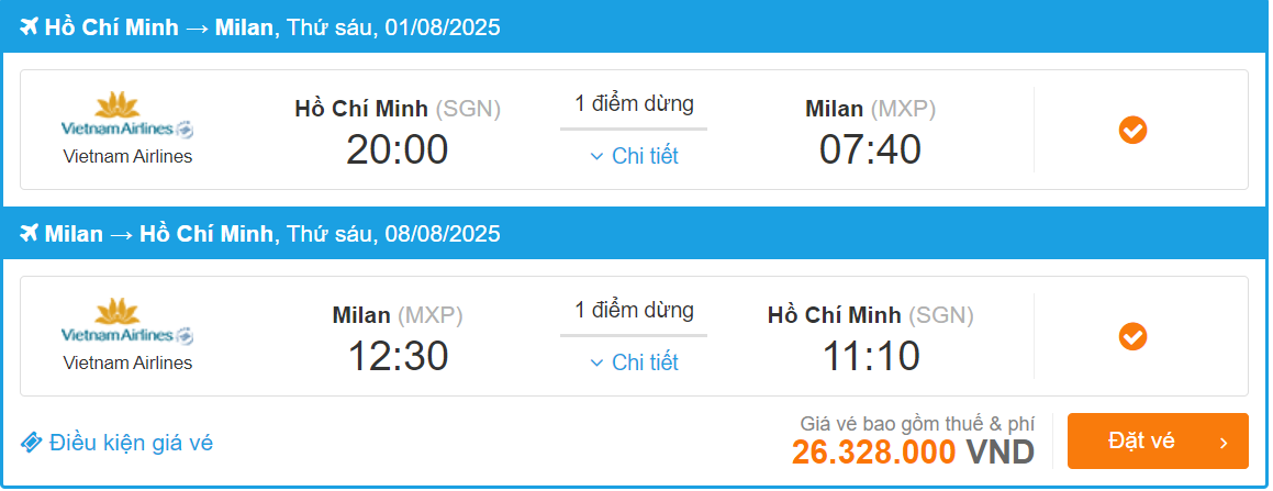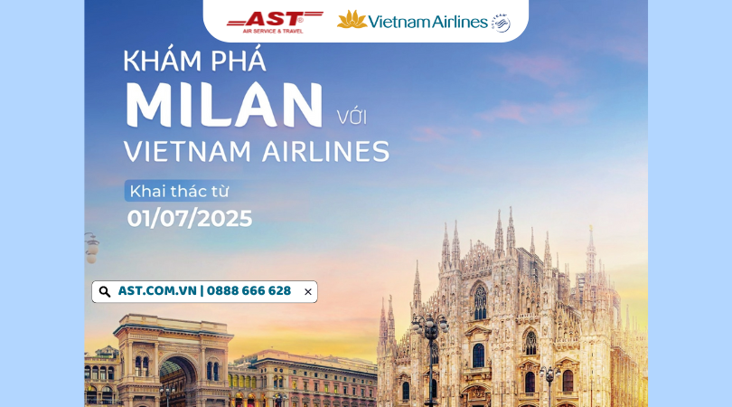 - Từ 01/07/2025 – 31/07/2025, Vietnam Airrlines tung giá vé máy bay đặc biệt từ Việt Nam (Hà Nội) đi Milan (MXP) chỉ từ 6.5 triệu đồng*/ khứ hồi.