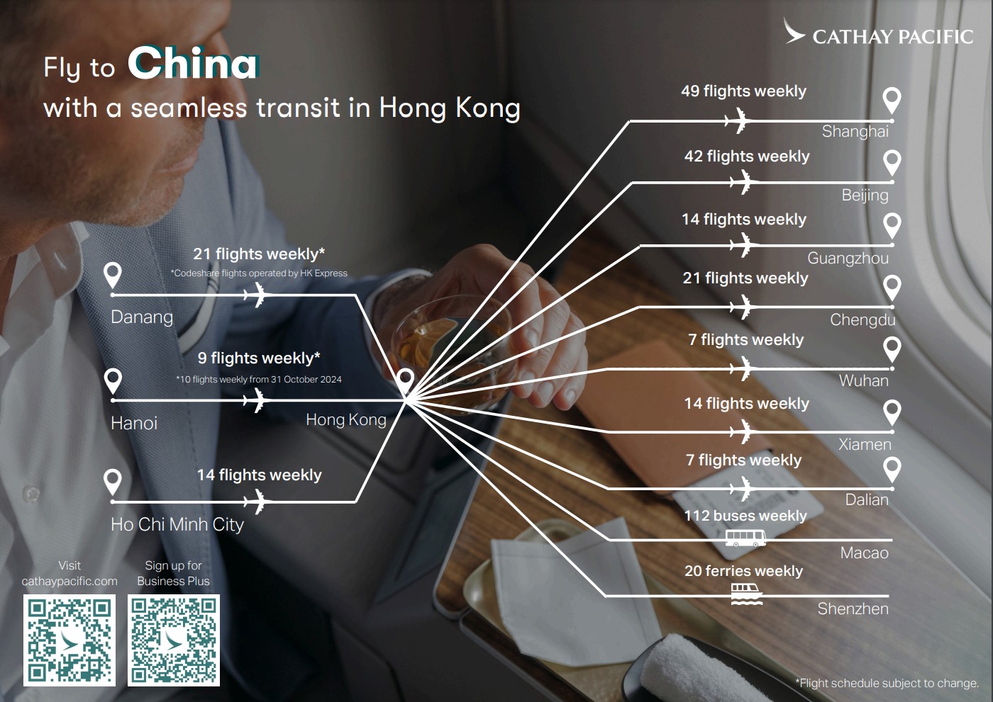- *Giá trên ĐÃ BAO GỒM thuế và các loại phụ phí khác tính theo thời điểm hiện tại tháng 10/2024 và chỉ áp dụng cho chuyến bay được khai thác trực tiếp bởi Cathay Pacific.