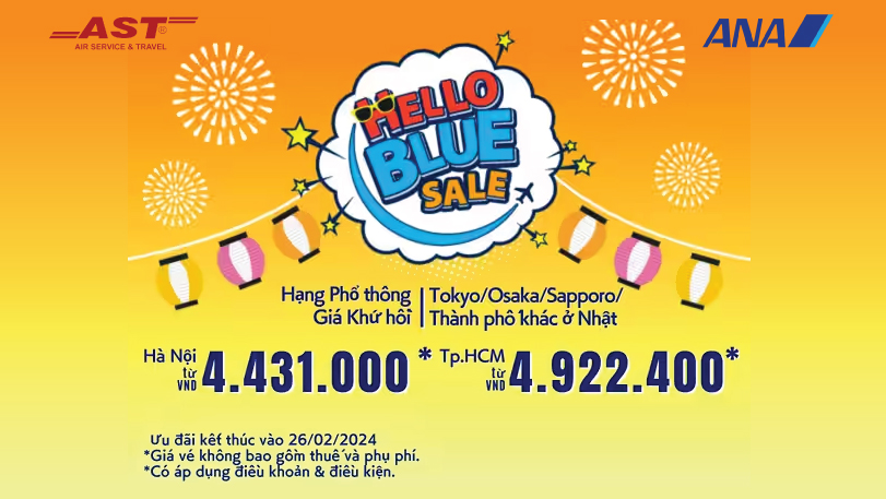 Hãng hàng không All Nippon Airways (ANA), hãng hàng không lớn nhất Nhật Bản với 7 năm liên tiếp được đánh giá 5 sao, tiếp tục khuyến mại lớn mang tên “Hello Blue Sale”, bắt đầu từ nay đến ngày 26/02/2024.