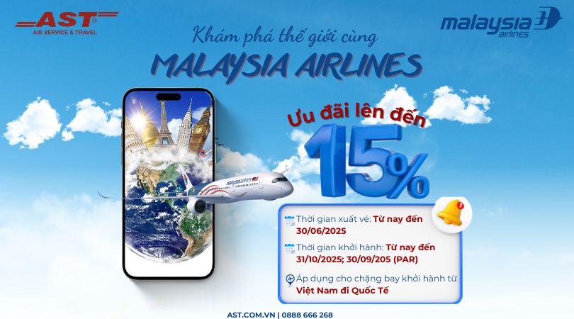 Nhanh tay đặt vé cùng AST Travel và tận hưởng ưu đãi độc quyền từ Malaysia Airlines. Chuyến đi mơ ước đang chờ bạn phía trước!