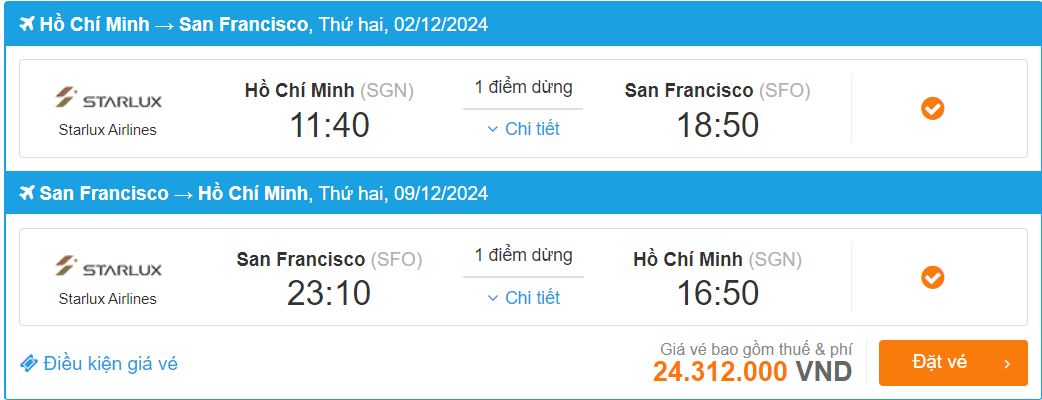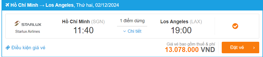 Tra cứu vé máy bay từ Tp.HCM đi Los Angeles từ tháng 9 đến cuối năm với hãng Starlux có mức giá vô cùng hợp lí. Giá vé cho chặng bay một chiều chỉ từ 10 triệu đồng và 20 triệu đồng cho chặng bay khứ hồi đã bao gồm tất cả các loại thuế, phí.