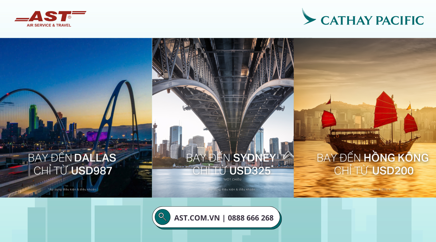AST Travel tự hào là đại lý chính thức của Cathay Pacific tại Việt Nam, sẵn sàng tư vấn và hỗ trợ quý khách lựa chọn hành trình phù hợp nhất.