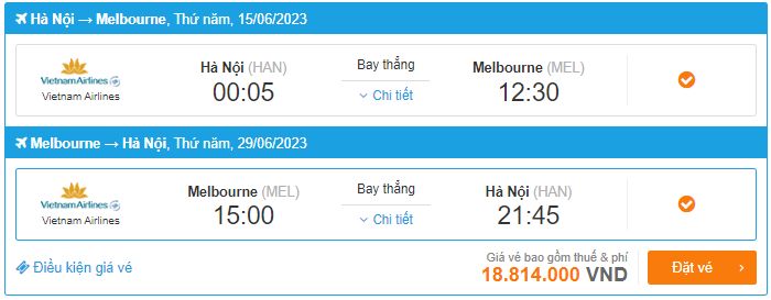 Giá vé khứ hồi Hà Nội - Melbourne chỉ từ 15.237.000 VNĐ (đã bao gồm thuế và phí) dành riêng cho đường bay.