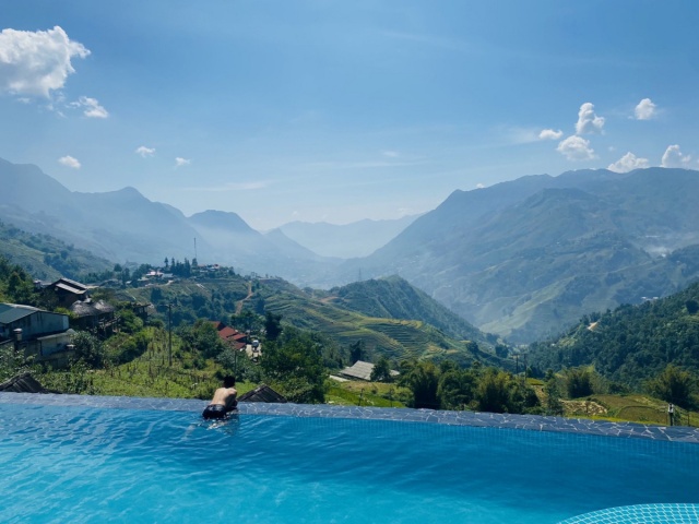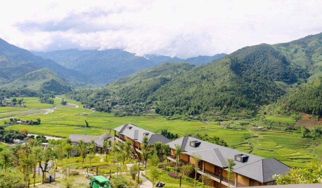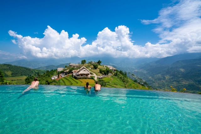 Khu nghỉ dưỡng ở bản Lao Chải - Tả Van, Sa Pa, Lào Cai. Bản này được khách du lịch truyền tai nhau là một trong những nơi ngắm lúa chín đẹp và dễ tiếp cận nhất ở Sa Pa. Khu nghỉ dưỡng ôm trọn tầm nhìn ra thung lũng Mường Hoa, bể bơi nằm ngay cạnh ruộng bậc thang, du khách vừa ngâm mình trong nước mát, vừa ngửi mùi lúa thoảng nhẹ hương thơm trong gió.