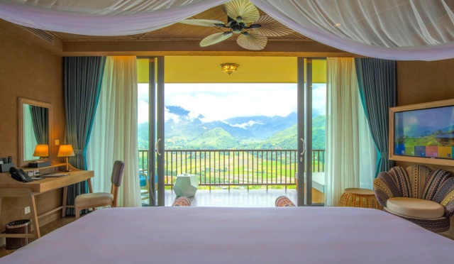 Các phòng có tầm nhìn ra thung lũng, giúp du khách ngắm được ruộng bậc thang ngay từ trong phòng. Kiến trúc mang hơi thở nhà sàn vùng Tây Bắc, các vật dụng trang trí trong phòng cũng mang nhiều hoạ tiết thổ cẩm. Giá một đêm nghỉ tại đây từ 4 triệu đồng.