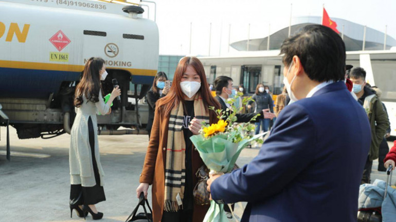 Cục trưởng Cục Hàng không VN Đinh Việt Thắng tặng hoa những hành khách đầu tiên bay thẳng đến Đức của Bamboo Airways
