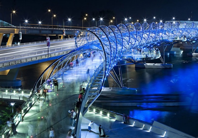 Nếu bạn muốn chiêm ngưỡng một công trình đặc biệt và mang “tầm cỡ” quốc tế, đừng bỏ qua cầu đi bộ Helix Bridge tại Singapore. Đây là chiếc cầu đi bộ có cấu trúc xoắn kép đầu tiên nổi tiếng nhất thế giới được hoàn thành xây dựng vào năm 2010. Cầu Helix nối trung tâm Marina với nam Marina trong khu vực Vịnh Marina, Singapore được mô phỏng theo cấu trúc 1 chuỗi ADN gồm 2 bộ phận vòng cung thép đối lập nhau được gắn lại bằng nhiều thanh nối.