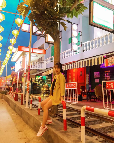 Một điểm đặc biệt khác của con hẻm nhỏ này chính là một đoạn đường sắt được thiết kế chỉn chu, y hệt như thật. Bạn có thể tự do thoải mái tạo dáng đứng, ngồi hay đi dạo để cho ra những bức hình “ảo diệu” nhất. Ngoài ra, bạn cũng có thể mượn những chiếc ghế, chiếc bàn từ quán, đặt ra giữa đường sắt và “chill” thôi, vì là đường sắt giả thôi.
