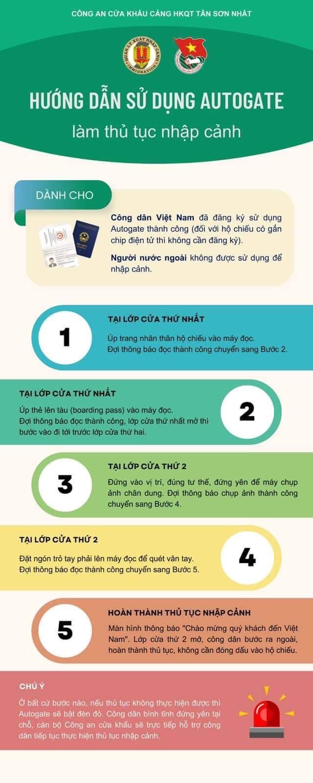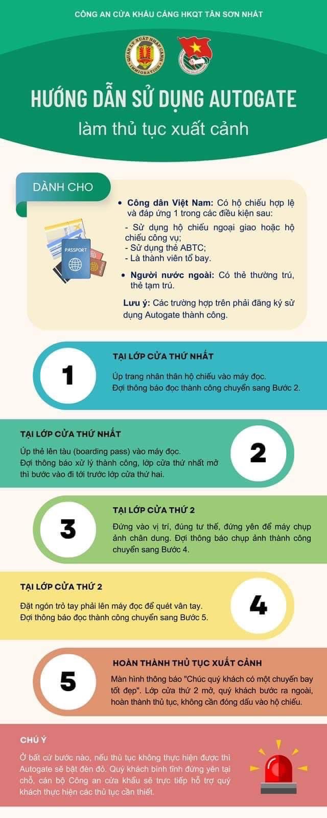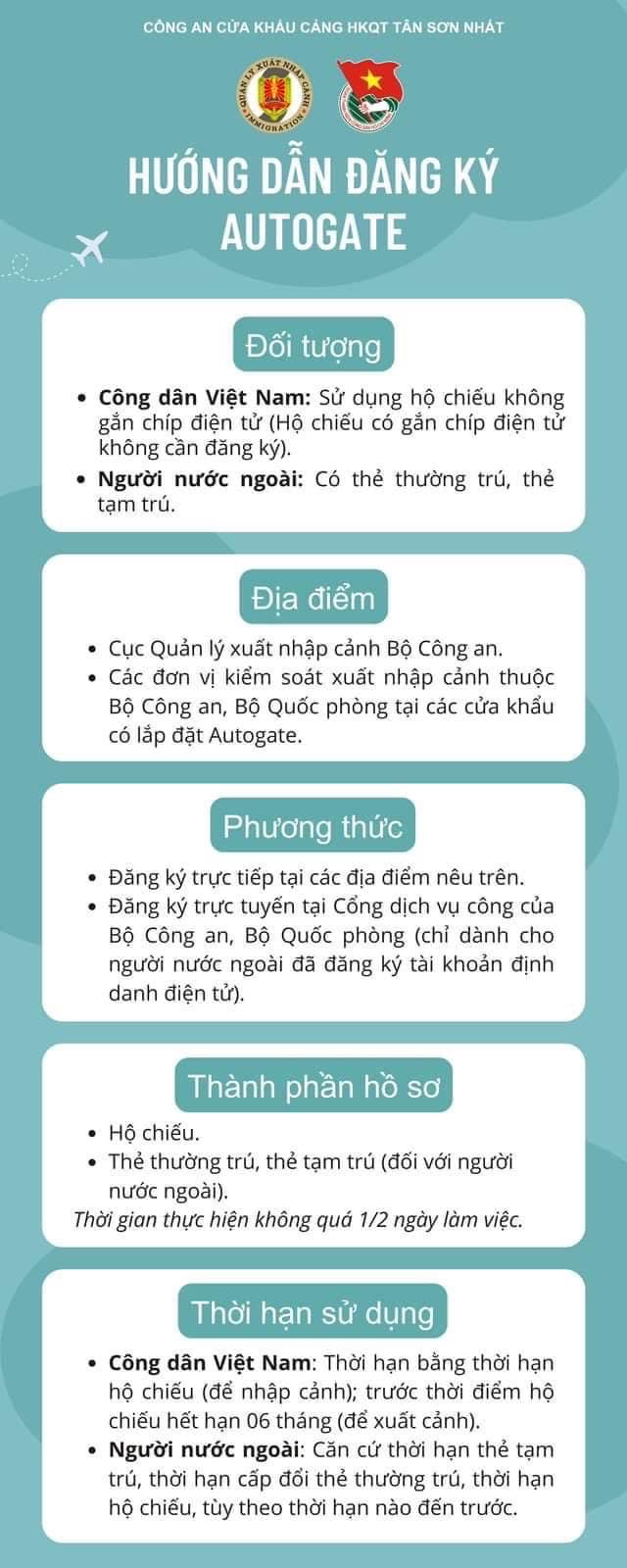 Theo Cục quản lý xuất nhập cảnh, từ 10 giờ 00 Ngày 01/08/2023, Công An cửa khẩu cảng hàng không quốc tế Tân Sơn Nhất bắt đầu triển khai đăng ký sử dụng và vận hành hệ thống cổng kiểm soát xuất nhập cảnh tự động (Autogate) tại cảng hàng không quốc tế Tân Sơn Nhất.