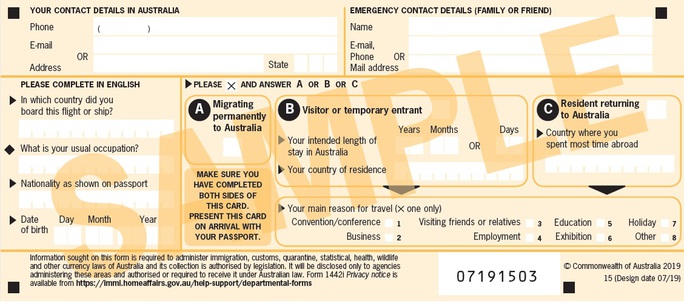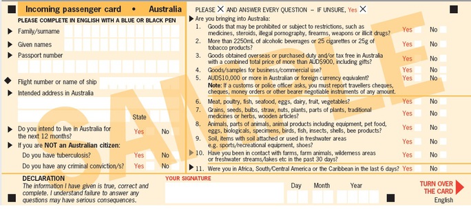Mọi du khách đến Úc sẽ nhận 1 tờ khai nhập cảnh. Họ có quy định những hàng hóa bị cấm hoặc hạn chế đem vào nước Úc.