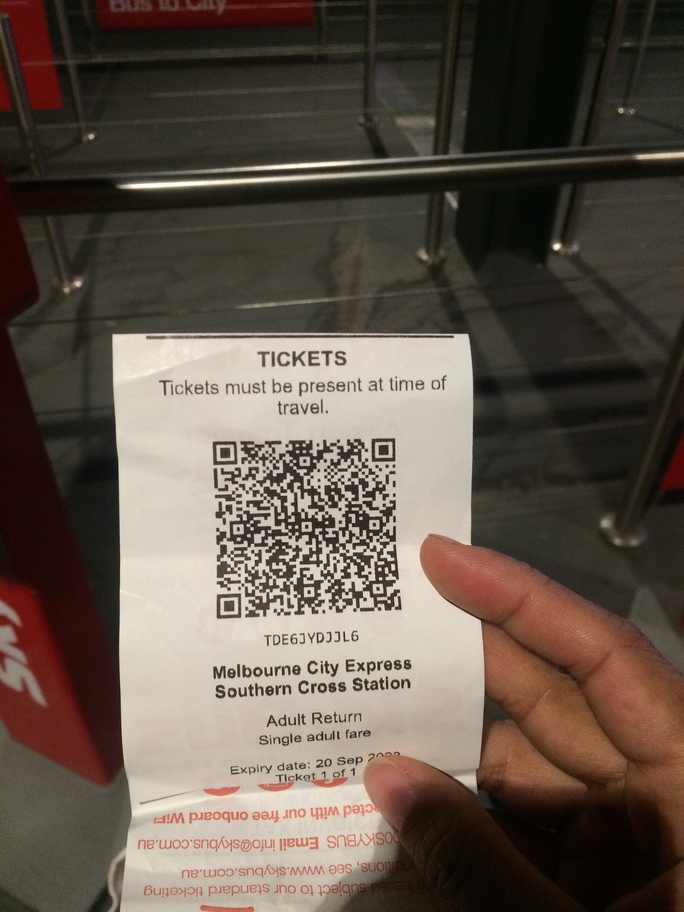 Tôi tới Melbourne đã hơn 22 giờ. Do muốn về nhanh để nghỉ ngơi rồi sáng mai dậy sớm đi tour núi tuyết, tôi mua vé skybus để về trung tâm. Vé xe buýt chỉ bán online hoặc bạn cần thẻ VISA để mua tại các máy bán vé tự động. Hoặc bạn có thể nhờ người dân ở Úc mua giùm rồi trả tiền mặt lại cho họ. Giá vé 1 chiều 22AUD nhưng vé khứ hồi chỉ có 36AUD, bạn sẽ tiết kiệm được 8AUD.