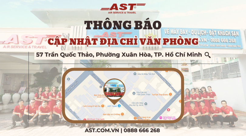 Để chuẩn bị cho kỷ nguyên mới này và tiếp tục mang đến chất lượng dịch vụ tốt nhất, AST Travel xin trân trọng thông báo cập nhật địa chỉ trụ sở chính của chúng tôi. Kể từ nay, quý khách hàng vui lòng lưu ý địa chỉ mới: