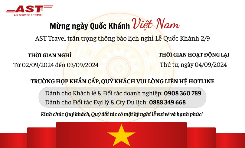 Nhân dịp kỷ niệm 79 năm Quốc Khánh 2/9, AST Travel xin trân trọng thông báo đến quý khách hàng và đối tác lịch nghỉ lễ như sau: