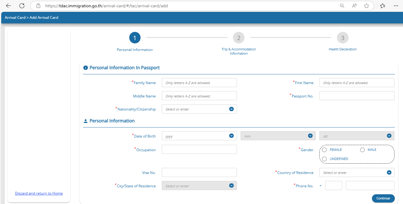 Người khai báo có thể truy cập trực tiếp vào website tdac.immigration.go.th hoặc quét mã QR được cung cấp trên trang để bắt đầu điền thông tin. Các thông tin cần cung cấp bao gồm: họ tên, quốc tịch, số điện thoại, email, số hộ chiếu, cùng với thông tin về hành trình như số hiệu chuyến bay và địa chỉ lưu trú tại Thái Lan (khách sạn hoặc nơi ở).