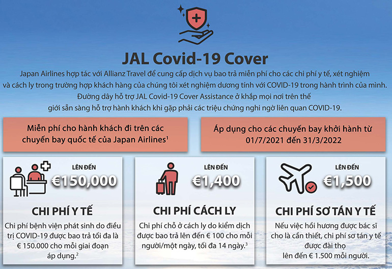 - JAL Covid-19 Cover: hỗ trợ miễn phí trong trường hợp nhiễm COVID-19