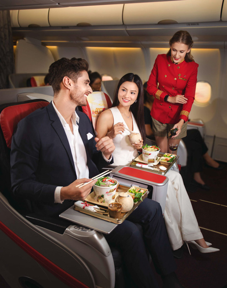 Sau màn khai vị, bữa tiệc trên không chính thức bắt đầu với hàng loạt món ăn truyền thống đậm phong vị Việt như bánh mì, phở bò, miến gà hay xôi mặn… cho đến các món ăn mang sự tươi nóng đến từ khắp nơi trên thế giới như bún gạo xào Singapore, cơm dừa Malaysia, miến xào tôm cua Thái, mì Ý sốt bò… được bày ra trong sự thích thú của những thực khách sành điệu nhất.
