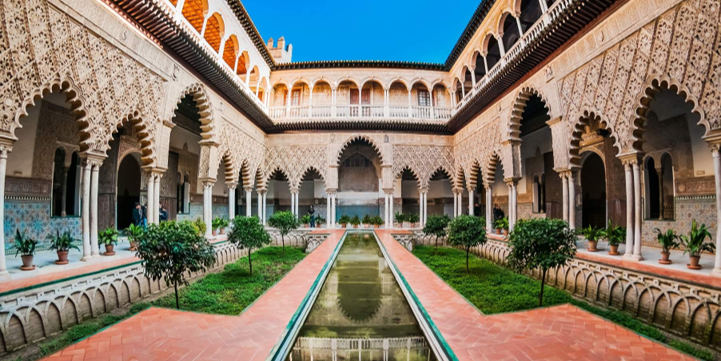 - Cung điện Alcazar of Seville - mang phong cách kiến trúc chủ đạo là Mudéjar với sự hòa trộn giữa đường nét châu Âu và chi tiết Ả Rập, cung điện khiến người ta choáng ngợp bởi sự đồ sộ.