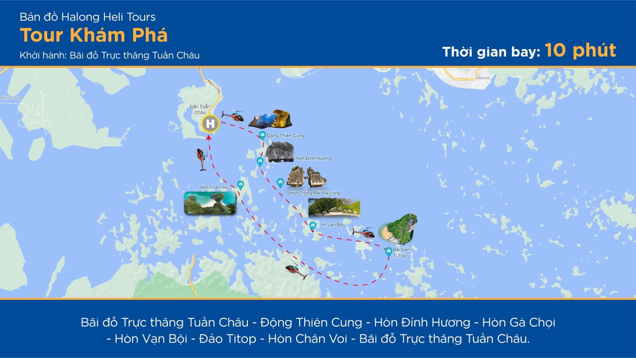 Tour trực thăng Khám phá 10 phút: Lịch trình: Sân đỗ Trực thăng Tuần Châu – Động Thiên Cung – Hòn Đỉnh Hương – Hòn Trống Mái – Hòn Vạn Bội – đảo Titop – Hòn Chân Voi – Sân đỗ Trực thăng Tuần Châu.