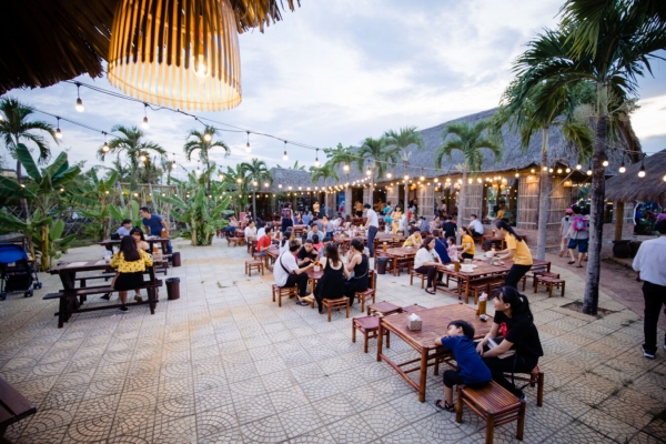 Thiết kế nhà hàng và cảnh quan khiến du khách cảm nhận như bước vào quán ăn thời xưa với mái tranh, tường gạch, bán ghế bằng tre…