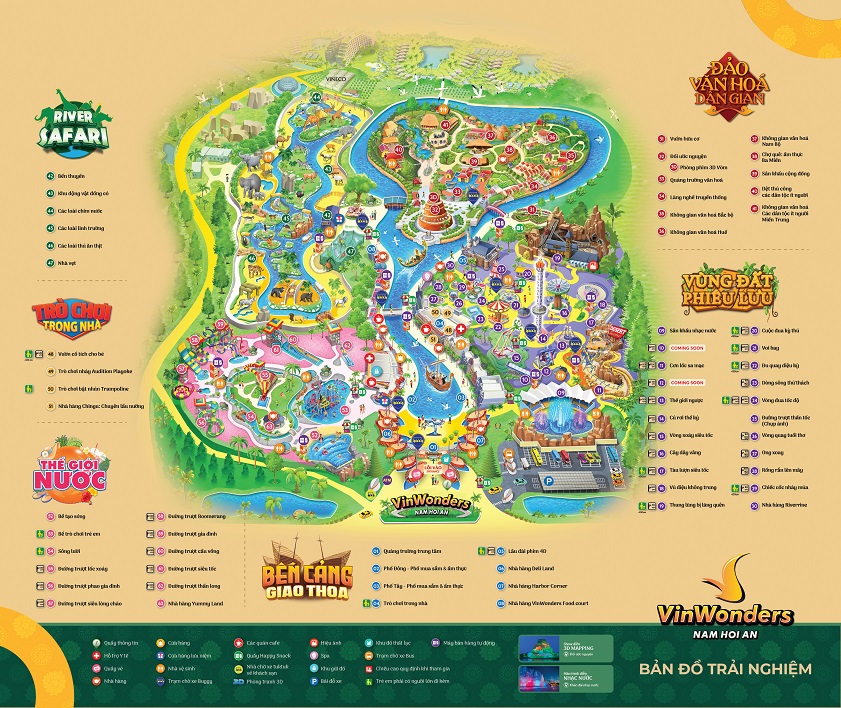 Có quy mô cực khủng, VinWonders Nam Hội An được xây dựng với 05 phân khu lớn là bến cảng Giao Thoa, Đảo văn hóa dân gian, River Safari, Vùng đất phiêu lưu và Thế giới nước. Nếu không có trong tay một tấm bản đồ VinWonders Nam Hội An, hành trình khám phá của bạn rất có thể sẽ thêm phần bối rối vì liên tục “lạc lối” trong thế giới văn hóa di sản và vui chơi giải trí rộng lớn này.