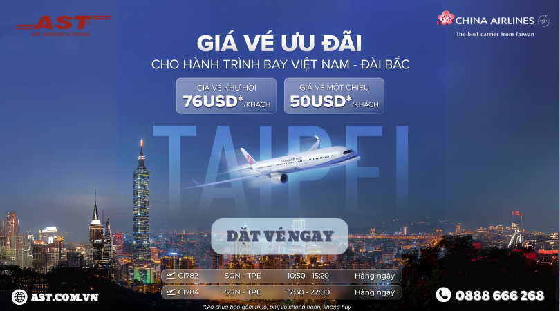Đừng bỏ lỡ cơ hội sở hữu vé máy bay giá tốt để khám phá Đài Bắc đầy sắc màu. Liên hệ AST Travel để được tư vấn nhanh chóng và đặt vé dễ dàng.