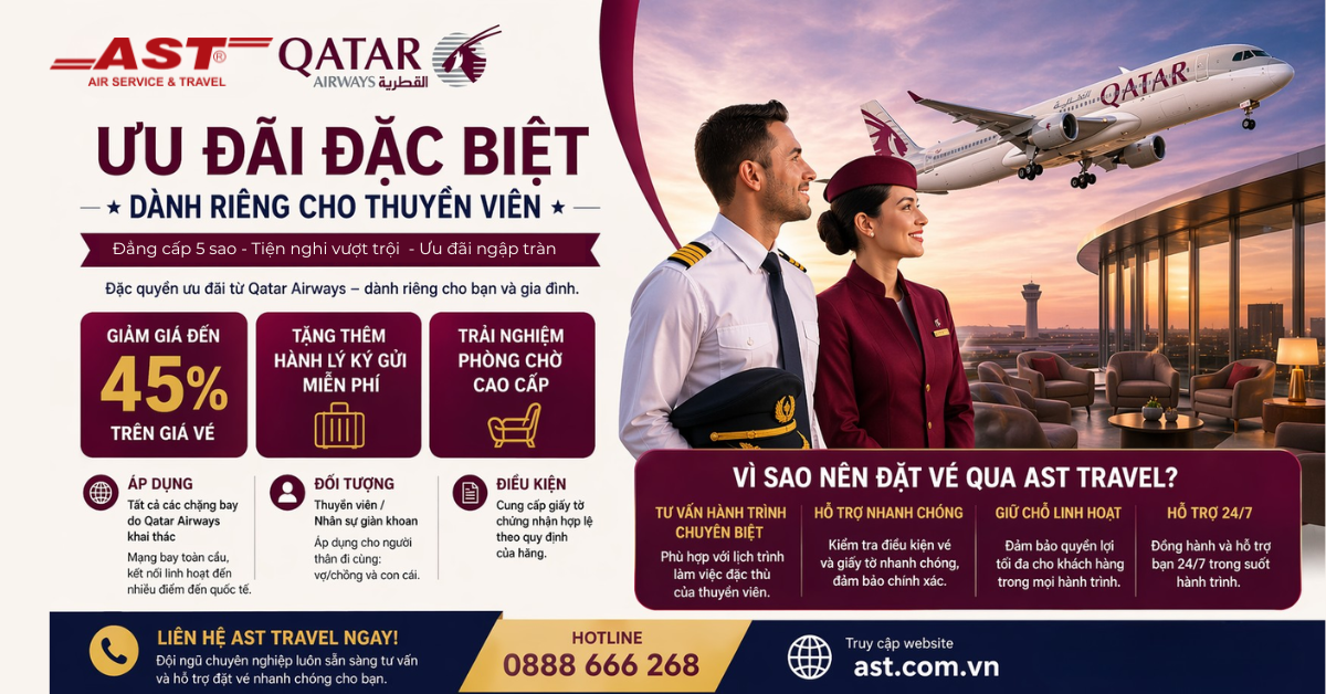 Hãng hàng không 5 sao Qatar Airways mang đến những ưu đãi cực lớn cho khách thuộc đối tượng Thuyền Viên và nhân sự dàn sao với những ưu đãi như sau