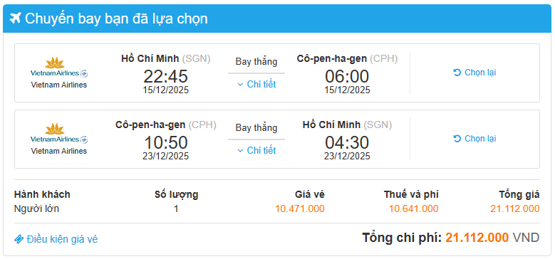 TP.Hồ Chí Minh (SGN) → Copenhagen (CPH) Hà Nội (HAN) → Quá cảnh TP.Hồ Chí Minh (SGN) → Copenhagen (CPH)