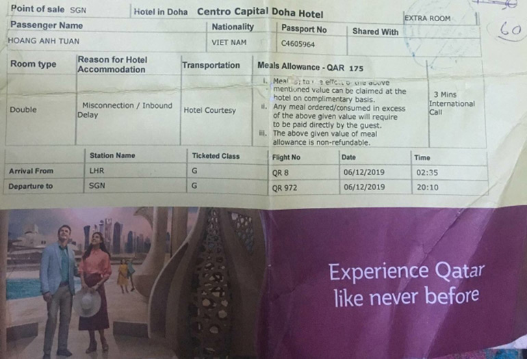 Chị Hoàng Thị Quỳnh Uyên, 38 tuổi, làm dịch vụ visa ở TP HCM, có chuyến đi Anh cùng chồng tháng 12/2019. Họ đặt vé qua một công ty du lịch, bay của hãng Qatar Airways. Sau lượt đi suôn sẻ, ở lượt về họ quá cảnh ở Qatar và bị delay chuyến về TP HCM tới 14 tiếng.