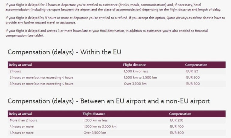 Sau khi tìm hiểu nhiều nguồn, chị Uyên cho biết quy định của khối EU và hãng Qatar Airways có phần bảo hiểm hoãn chuyến cho khách hàng. Thông tin trên website của Qatar Airways cho thấy khoản đền bù hoãn chuyến (giữa một sân bay EU và một sân bay ngoài EU) cao nhất là 600 euro mỗi người (cho thời gian hoãn từ 4 tiếng trở lên, và khoảng cách bay hơn 3.500 km).