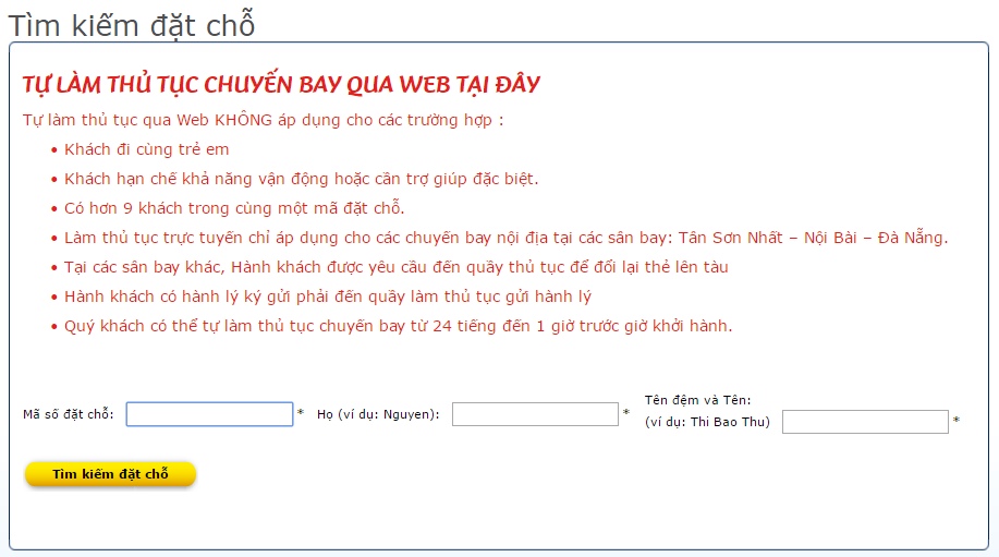 Hệ thống làm thủ tục trực tuyến của Vietnam Airlines không áp dụng cho các hành khách sau đây: