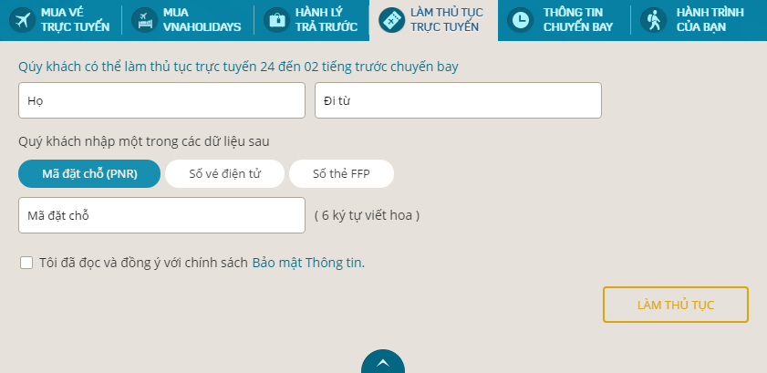Bước 2: Nhập thông tin Họ, Đi từ sân bay nào và nhập Mã đặt chỗ hoặc Số vé điện tử hoặc "Số thẻ khách hàng thường xuyên". Chỗ này đặc biệt chú ý vì nếu bạn để lộ thông tin về Họ cùng với Mã đặt chỗ, Số thẻ FFP là người khác có thể check-in “hộ” bạn đấy. Cuối cùng bạn nhấn "Làm thủ tục".
