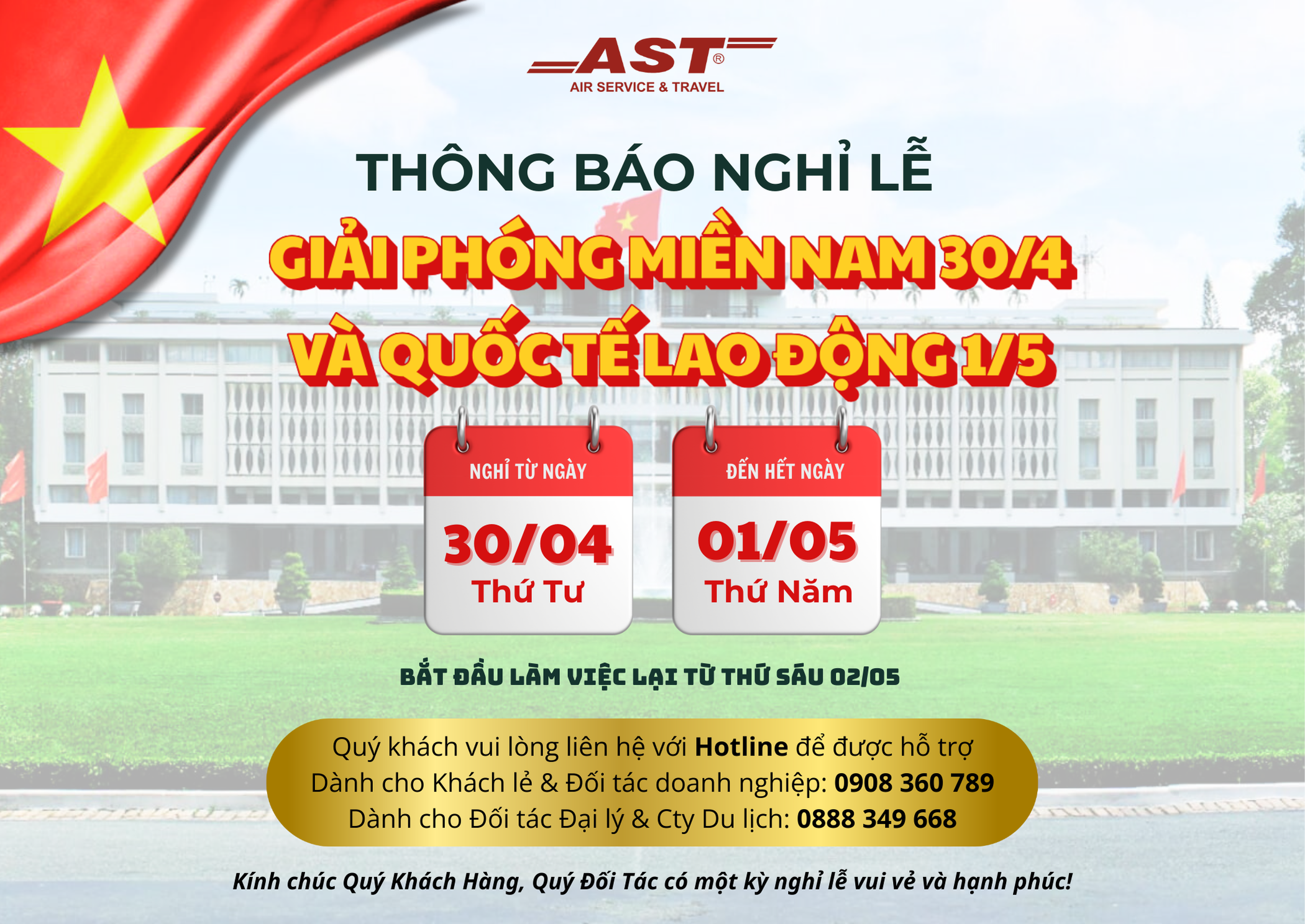 Năm 2025 đánh dấu 50 năm Ngày Giải phóng miền Nam, thống nhất đất nước – một cột mốc lịch sử hào hùng, thiêng liêng đối với mỗi người dân Việt Nam. Hòa trong không khí rộn ràng, tự hào của cả nước, AST Travel xin trân trọng thông báo lịch nghỉ lễ 30/4 và 1/5 như sau: